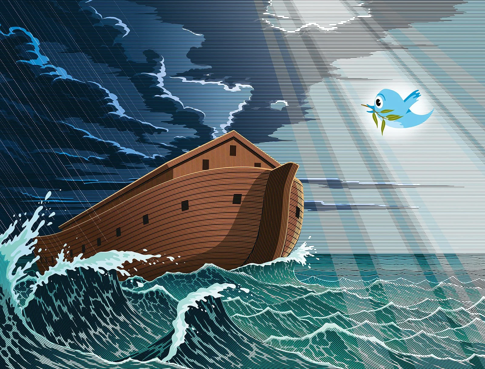 illustration of Noah's Ark sailing on the sea with a bird in a stormy sky