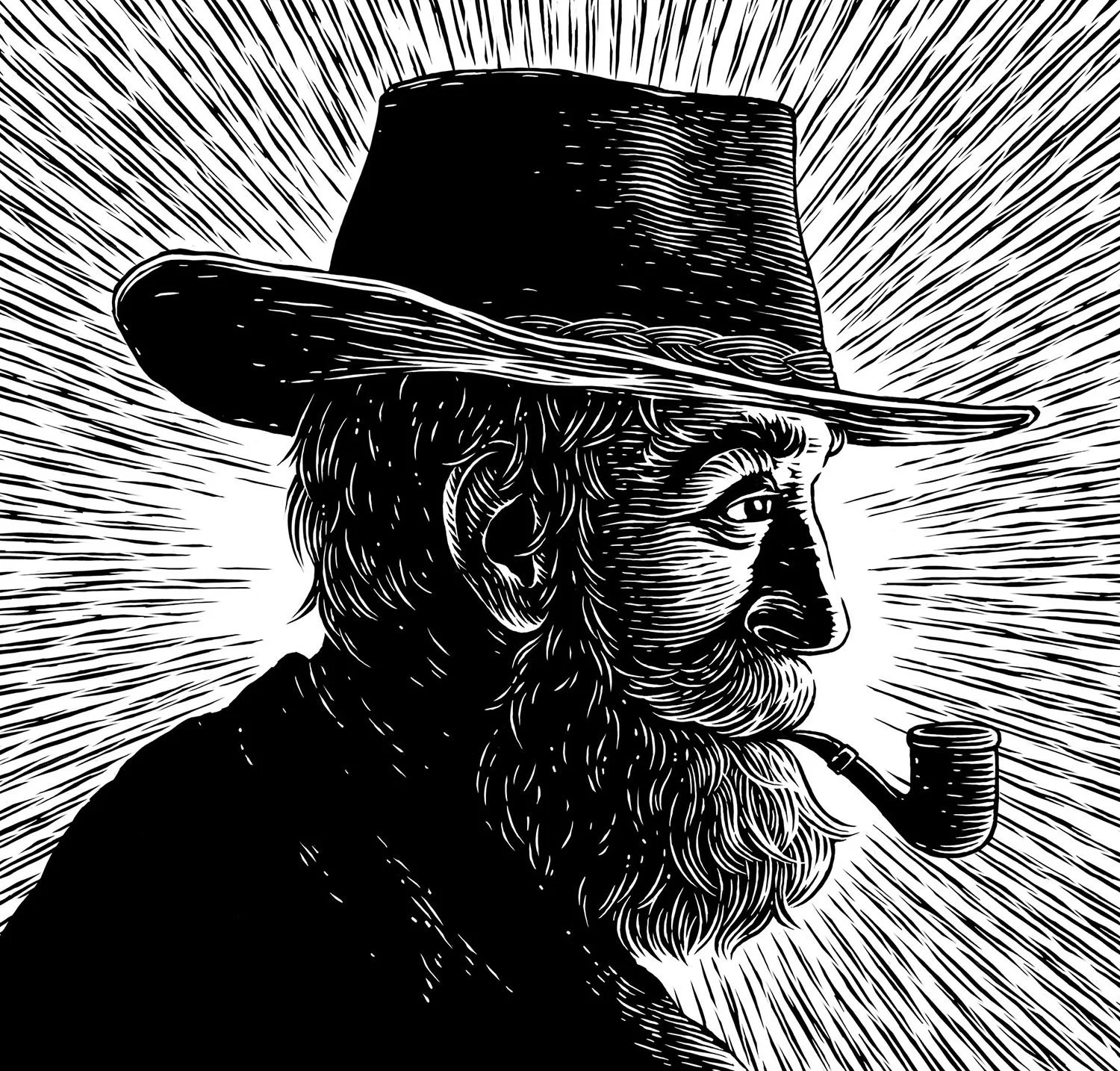 scratchboard portrait illustration of a distinguished elderly man smoking a pipe